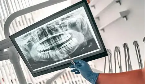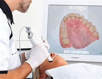 - On the screen, there is a 3D model of teeth with highlighted areas (likely for crowns or fillings).